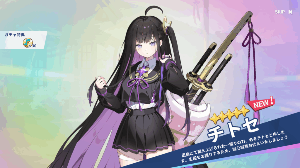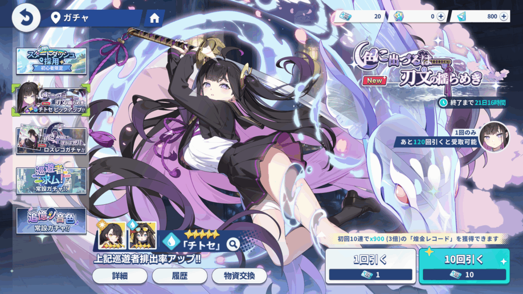 ⑥20連分ガシャチケが手に入るのでピックアップの「チトセ」を引く