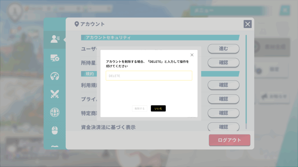 ④アカウント削除を選択し、規約への同意、DELETEを入力して削除します。